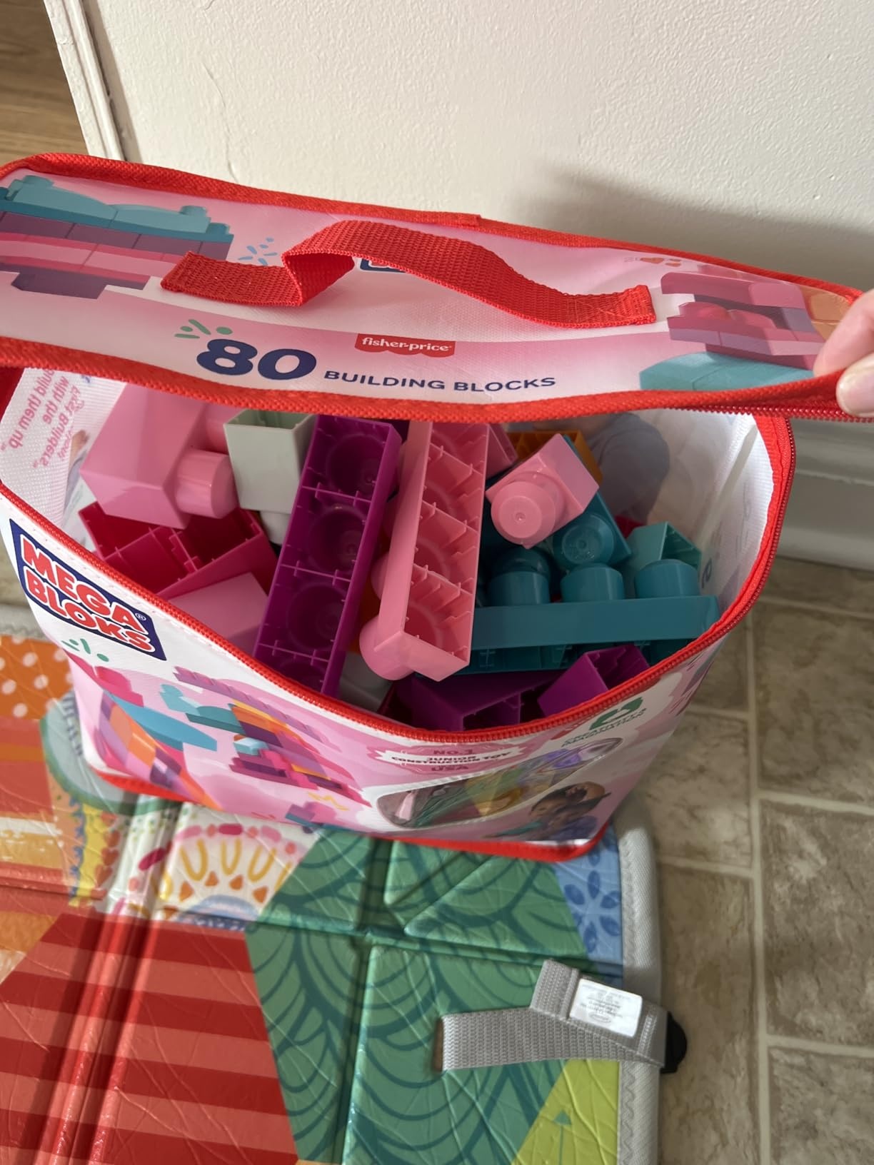 Big Building Bag 80 pieces in pink with storage – fun color for toddlers. Safe, large blocks for easy building. Encourages creativity and fine motor skills – great for girls or any child.